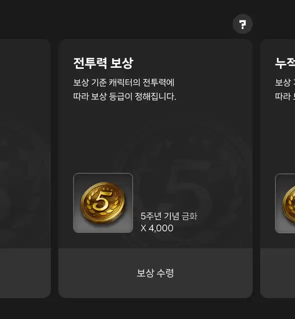 이벤트 보상은 모두 [5주년 기념] 금화가 지급되며, 자동으로 설정되는 보상 기준 캐릭터의 전투력과 누적 결제금액에 따라 지급되는 수량이 달라질 수 있습니다.